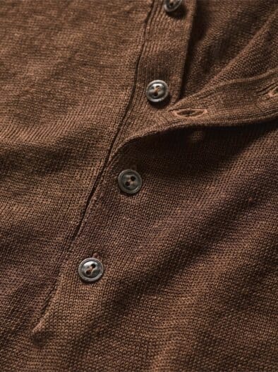 Nach dem Vorbild des Rowing-Sweaters. Ihm haftet die Aura des Mannes an, der eher schwitzt als friert - locker gestrickt aus reinem Leinen, luftig kühl und doch gehaltvoll. Seine Knöpfe in Holzoptik und die sich sanft einrollenden Kanten lassen den Sweater viel angezogener wirken als übliche Pullover. Lässig zu Jeans, Shorts und Leinenhose, mondän zum Anzug. Je nach Temperatur und Tagesform mit Hemd oder T-Shirt darunter oder komplett ohne.